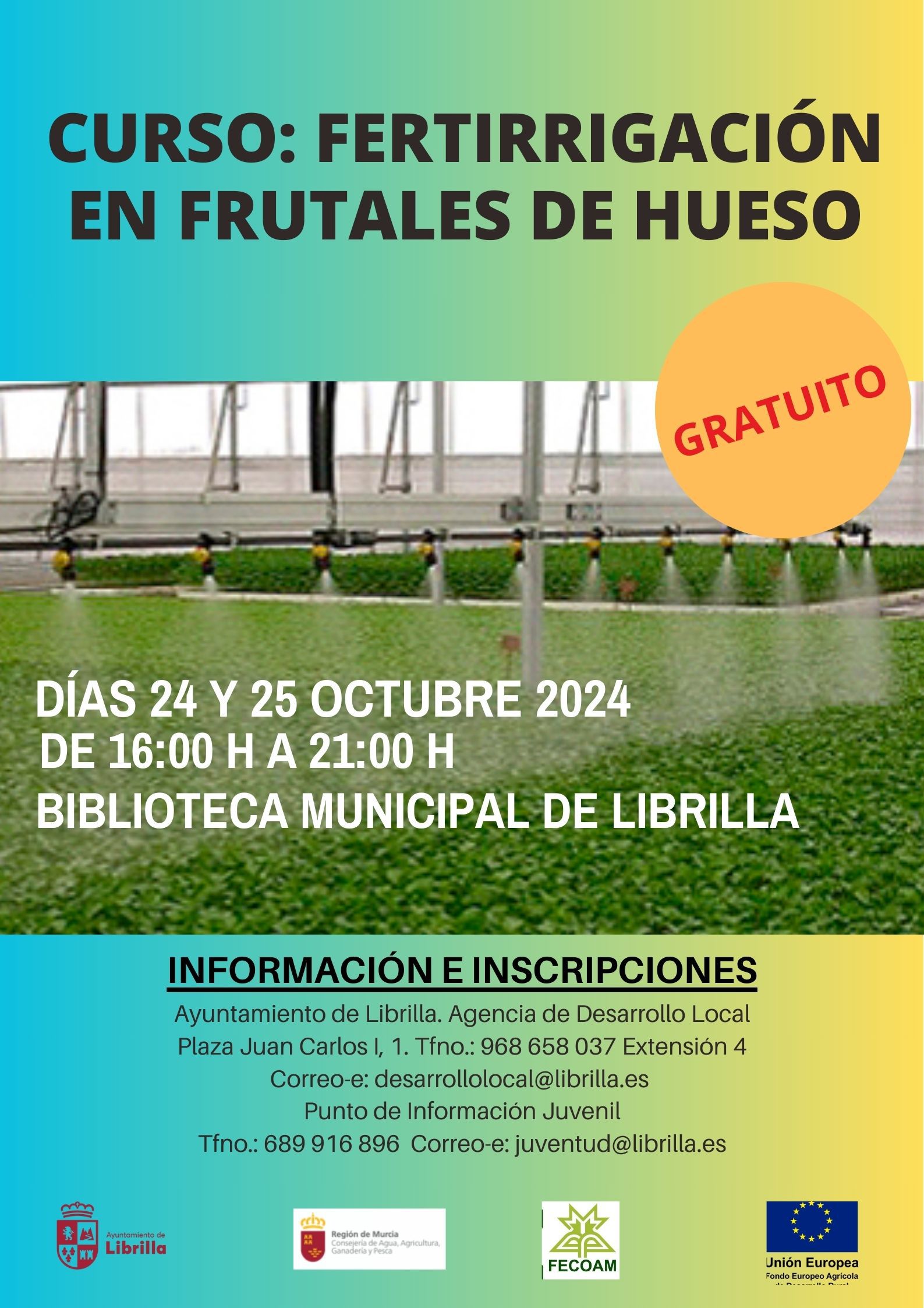 El Ayuntamiento de Librilla va a impartir el curso de Fertirrigación en Frutales de Hueso los días 24 y 25 de octubre en horario de 16:00 a 21:00h., contando con un total de 10 horas. Hay que remarcar que se trata de un curso subvencionado por FECOAM y homologado por la Consejería de Agua, Agricultura, Ganadería y Pesca.