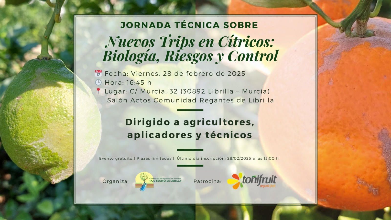 La Comunidad de Regantes del Trasvase Tajo-Segura de Librilla ha realizado, con el patrocinio de Toñifruit, una Jornada Técnica sobre Nuevos Trips en Cítricos: Biología, Riesgos y Control para que los agricultores, aplicadores y técnicos pudieran solventar todas sus dudas entorno a esta plaga, así como conocer en profundidad al trips.